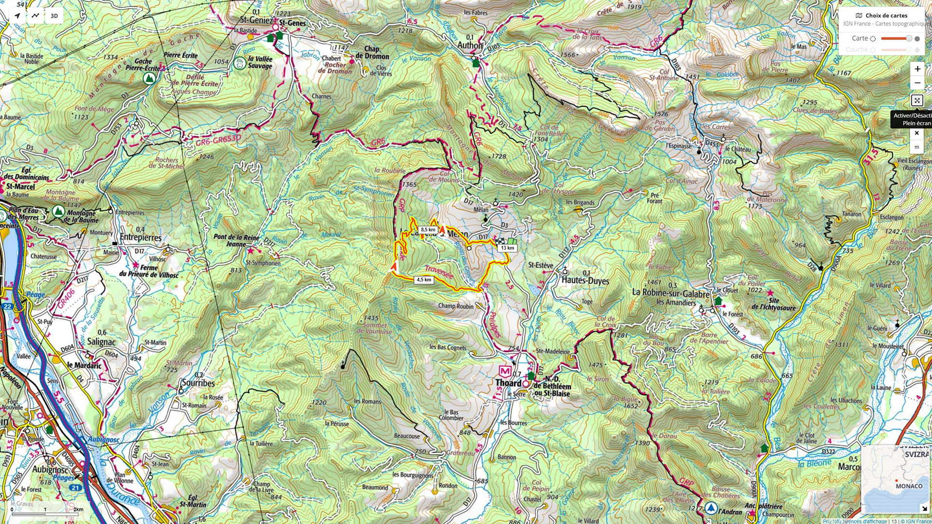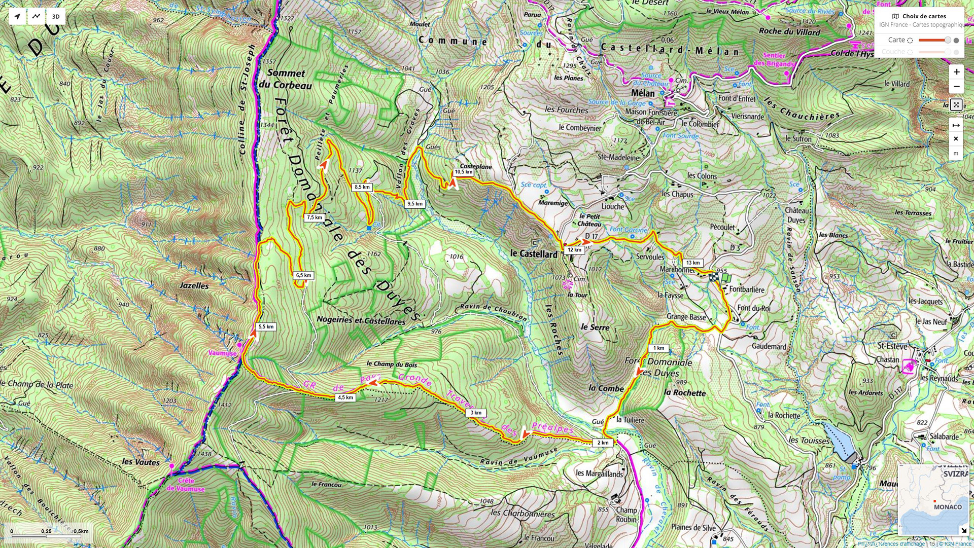 Rejoindre le chemin de la GTPA après avoir traversé le radier du ravin des Graves, puis direction Thoard jusqu'au poteau téléphonique ou arrive la GTPA. Prendre à droite et poursuivre sur une montée bien marquée jusqu'en crête à proximité du sommet de Vaumuse, prendre plein Nord et au point le plus bas avant le sommet du Corbeau, "les Gorges", prendre sur la droite l'amorce de sentier vers l'Est, l'ancien chemin de Sisteron au Castellard, un parking des "postés" dans le langage de la chasse et rejoindre la piste d'exploitation principale, prendre plein Nord sur la gauche. Assez loin, une demi-heure environ, peu après une clairière bien dégagée (panneau Parking) poursuivre jusqu'au prochain virage à droite de la piste. En ce point vous faites un tout droit pour abandonner la piste, puis descendre à droite en longeant le bois, le sentier vous amène au ravin des Graves. Montée jusqu'au Castellard et suivre la RD17 en descendant.