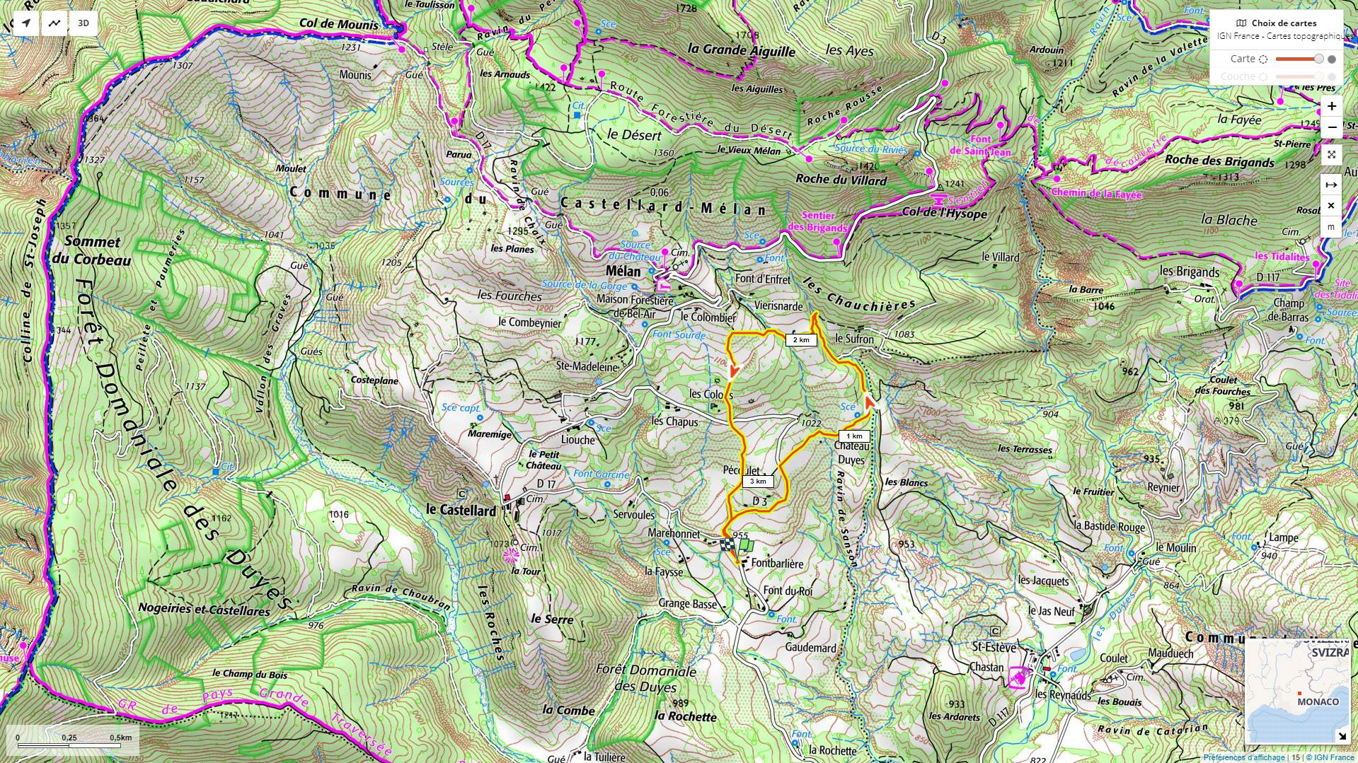 Avant de bifurquer sur la droite vers Château-Duyes et Manent, 500 m de route goudronnée RD3 montante, suivre ensuite deux panneaux Mélan à 1,5 km et à 2 km, en cours de montée à 2,3 km, au niveau d’un regard de contrôle du réseau d’eau sur le talus en face, prendre à gauche en descendant, longer le hameau des Colons, traverser la RD3 et emprunter le chemin public descendant (panneau) jusqu’à la borne incendie n°2, puis 200 m de RD3 vers l’aval pour rejoindre le point de départ.