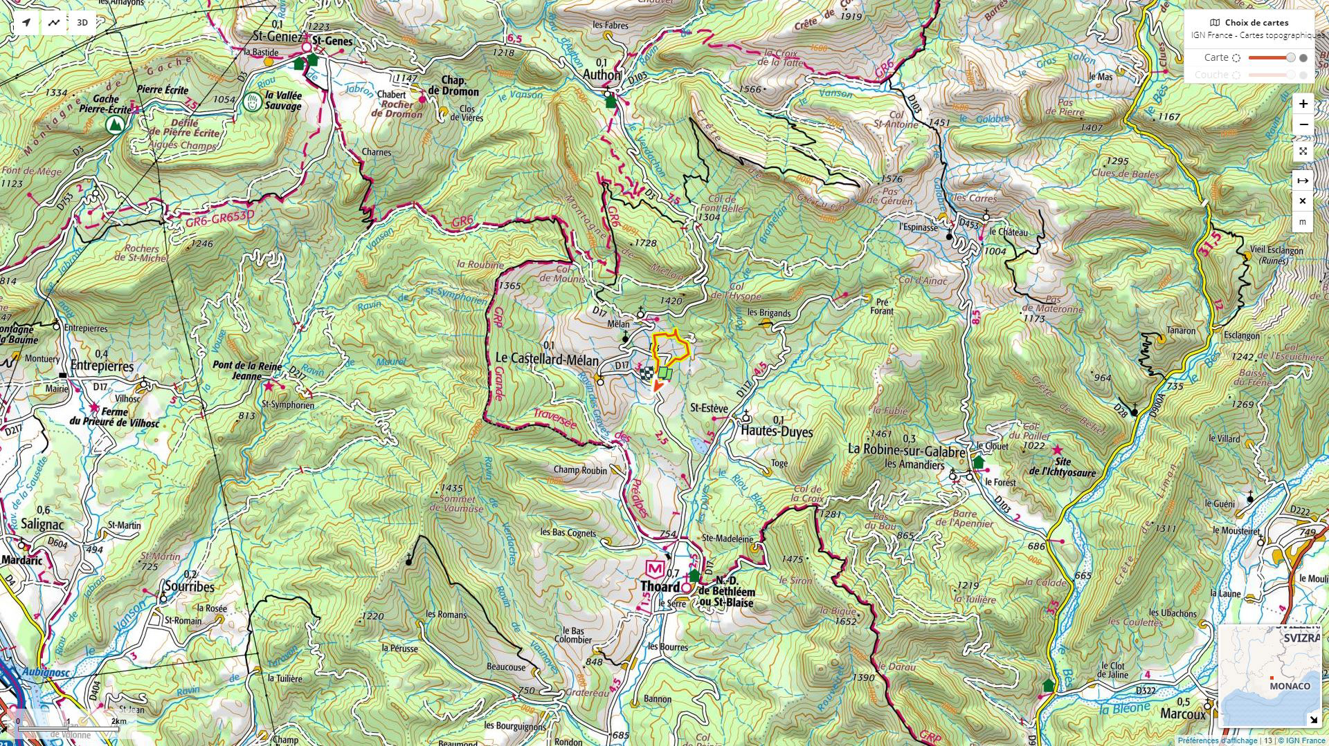 Départ Fontbarlière, route RD3, point kilométrique 19,700, entre Thoard à 4 km et le col de Fontbelle à 7 km.