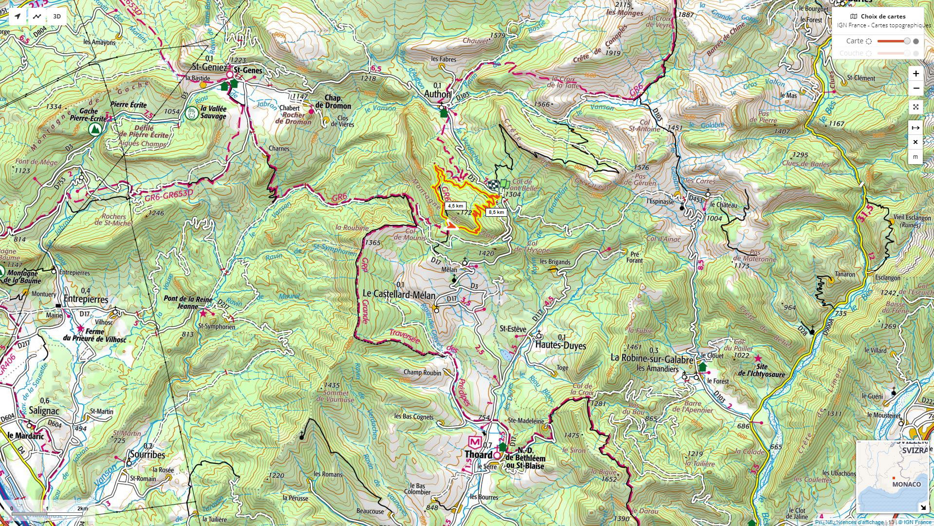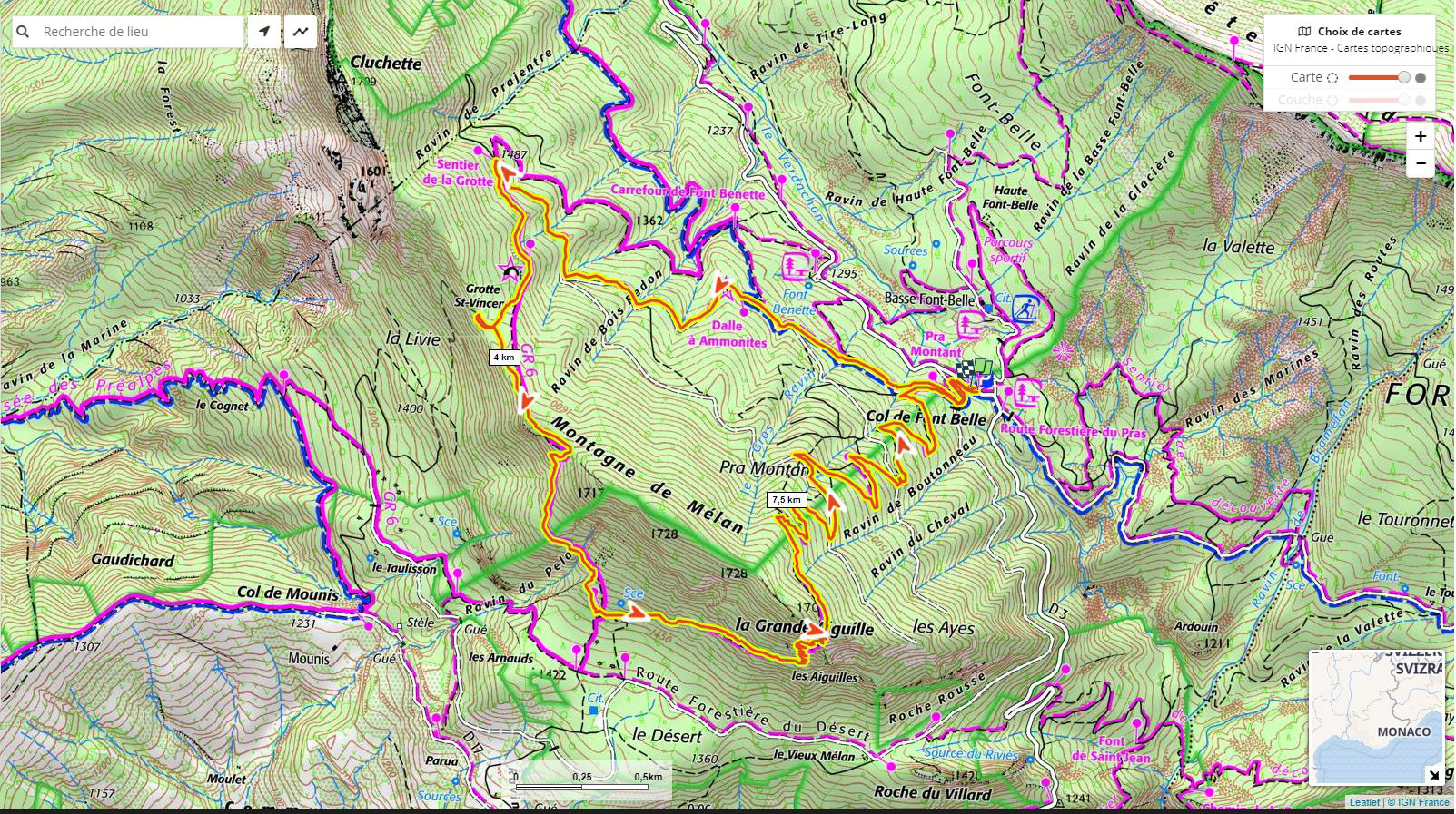 L'itinéraire le plus naturel pour accéder à l'entrée de la Grotte de Saint-Vincent, commune du Castellard-Mélan : Départ du site de pleine nature du col de Fontbelle, suivre la piste forestière à l'ubac vers l'Ouest, direction la grotte Saint-Vincent. Passage devant une dalle aux ammonites, puis vous atteigniez le GR6 qui monte vers la grotte et la crête. Point de vue, à l'écart proche, avant la crête, piquet avec balisage, prendre légèrement sur la droite pour y accéder. Reprendre le GR6, descendre côté adret jusqu'à embranchement vers la Grande Aiguille, montée et descente pour retour au point de départ.