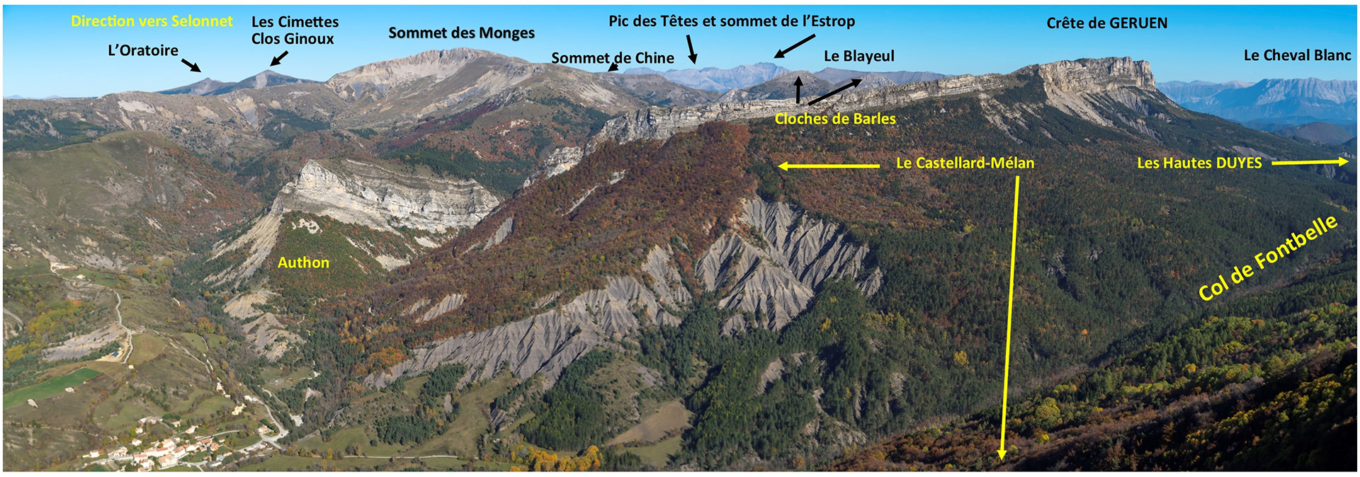 Ce trajet remarquable, en vue ci-dessus, est celui défini par le circuit Retrouvance* du Tour des Monges entre Barles et le col de Fontbelle. Une alternative au GR6 en creux de vallée! et qui pourrait constituer une variante Grande Randonnée entre la Croix de Veyre, la montagne de Mélan, la Grande Aiguille, et arpentant l'emblèmatique barre de Géruen.