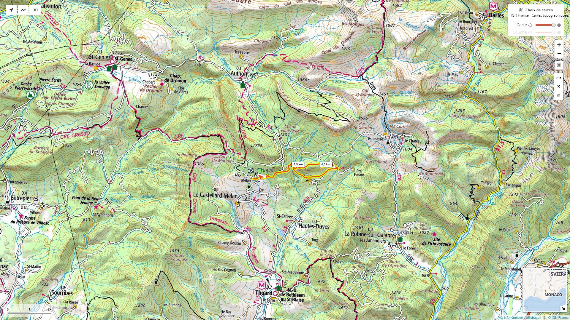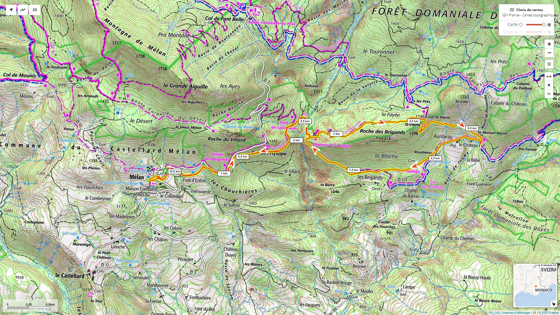 A la sortie de Mélan, suivre le sentier en contrebas de la route, 700m, 200m de route jusqu'au sentier en aval du col de l'hysope vers le ravin du Bramefan, effectuer le tour de la roche des Brigands qui vous mène à Auribeau. Ancien château, église et cimetière. Retour par le même chemin depuis les vallons de Bramefan et de Chabretière (en provenance du col de Fontbelle)