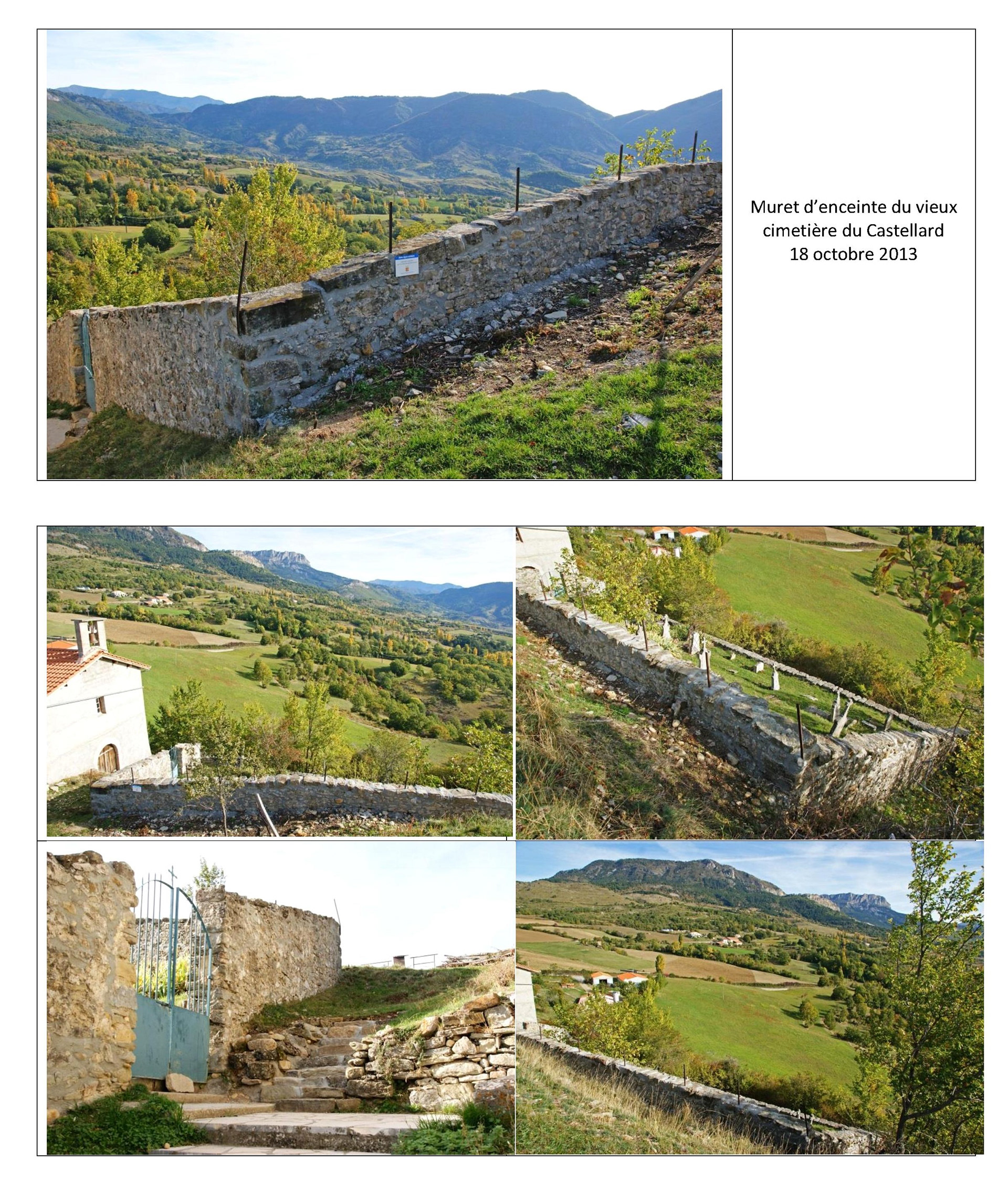 Deux panneaux rigides 50 cm x 100 cm réalisés et remis gracieusement en deux exemplaires, l'un pour la salle du conseil municipal de 2013 à 2022, l'autre mis à disposition des excursionnistes sur le muret de l'ancien cimetière du Castellard.