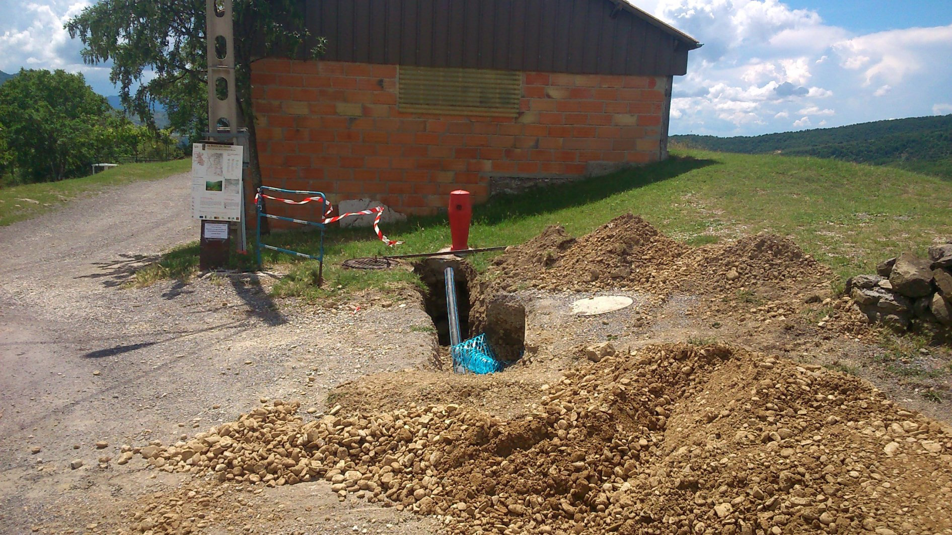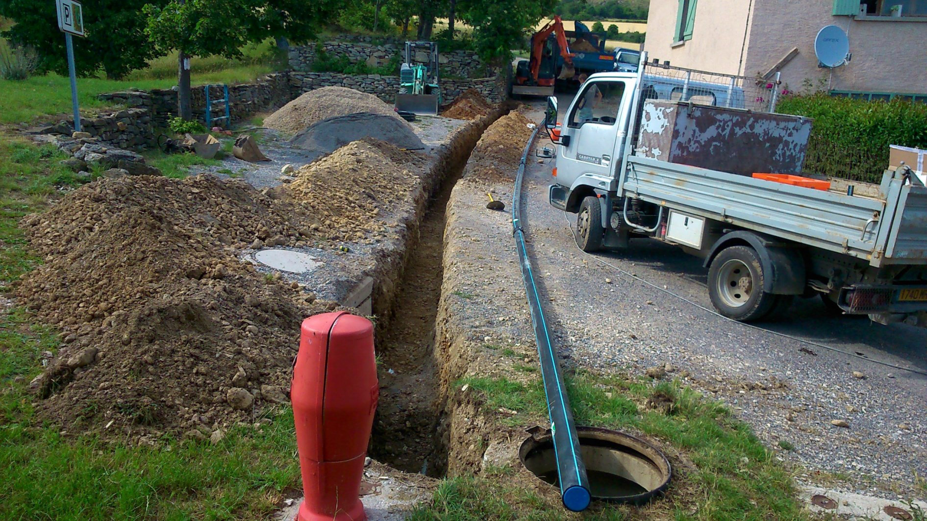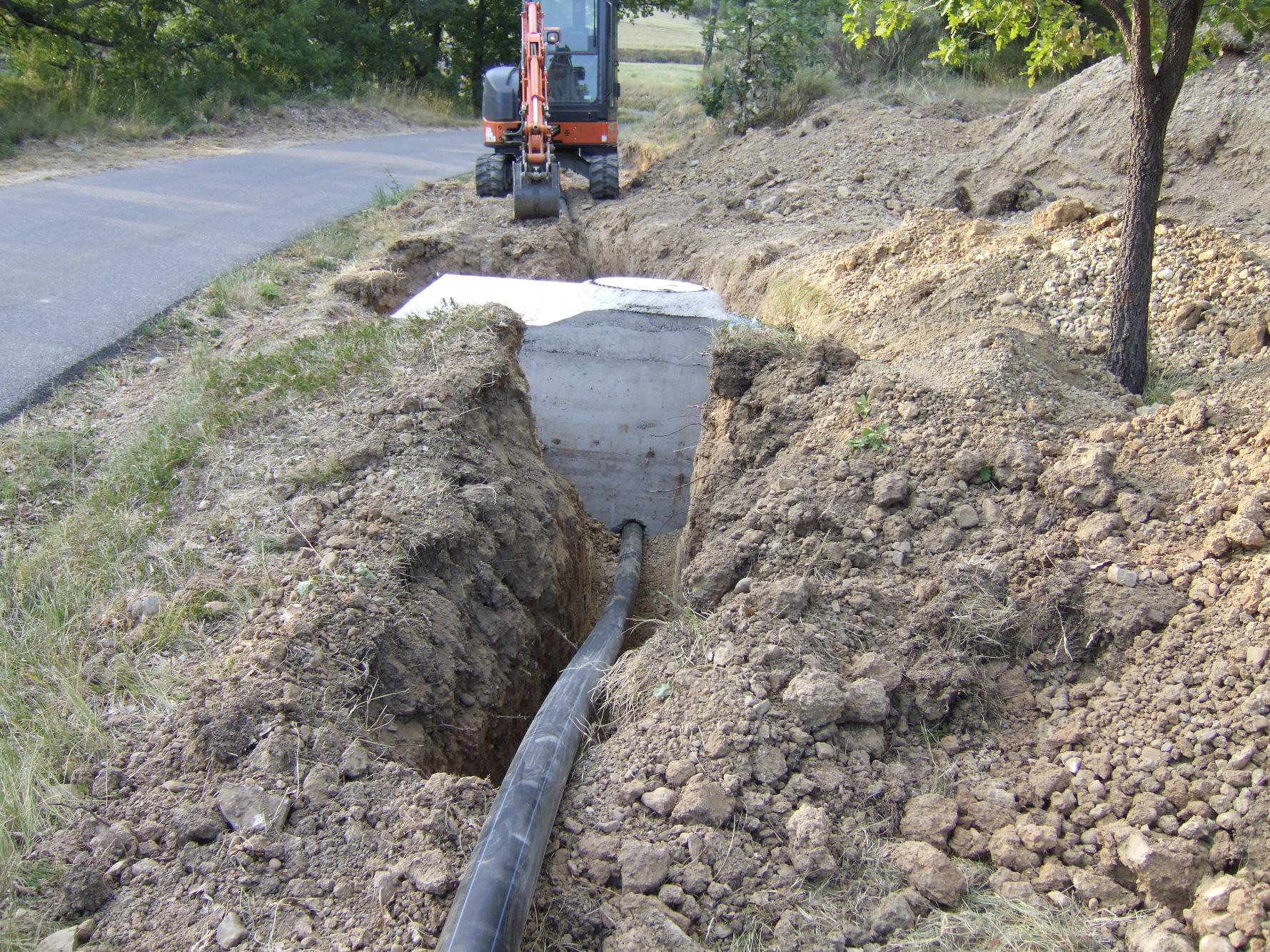 Eaux pluviales route + eaux de toiture Mairie, arrivée de l'eau de source en 32 mm pour l'table et grange sur la droite de la photo