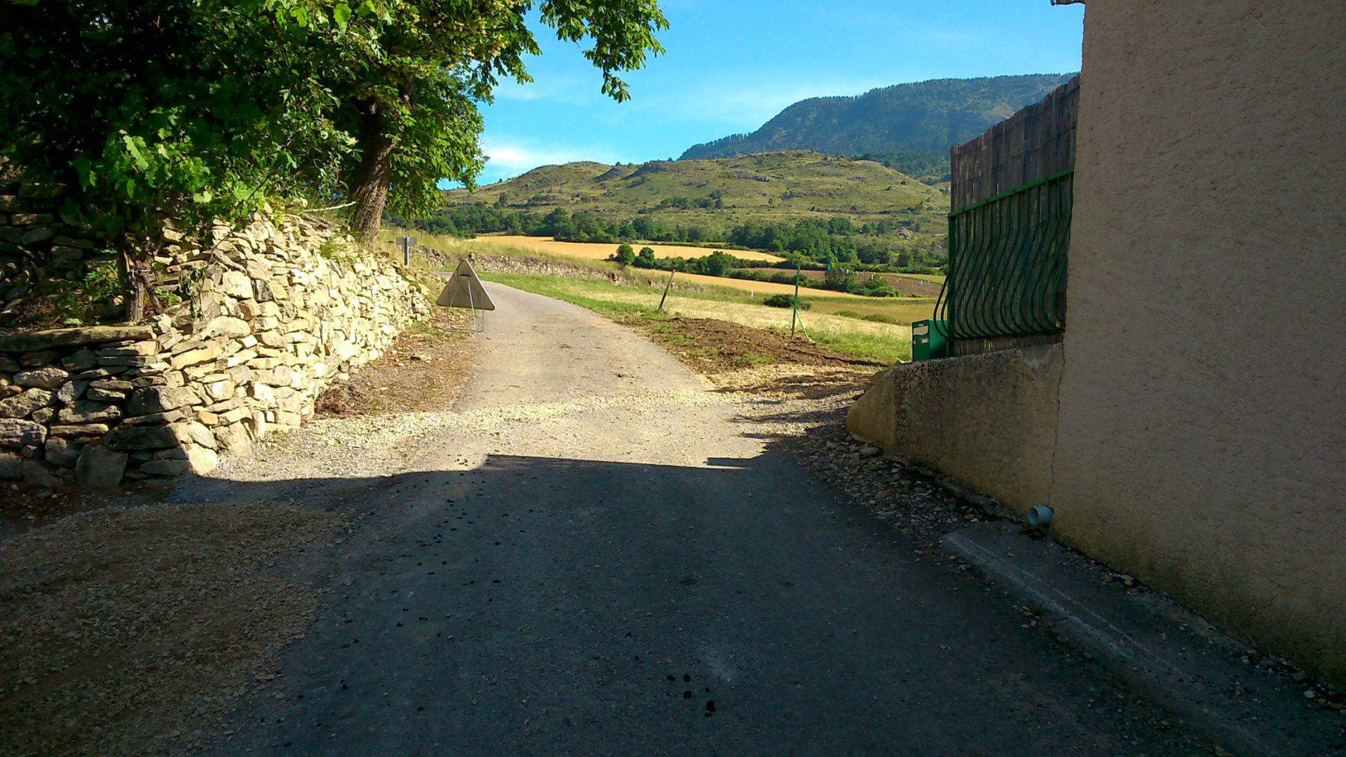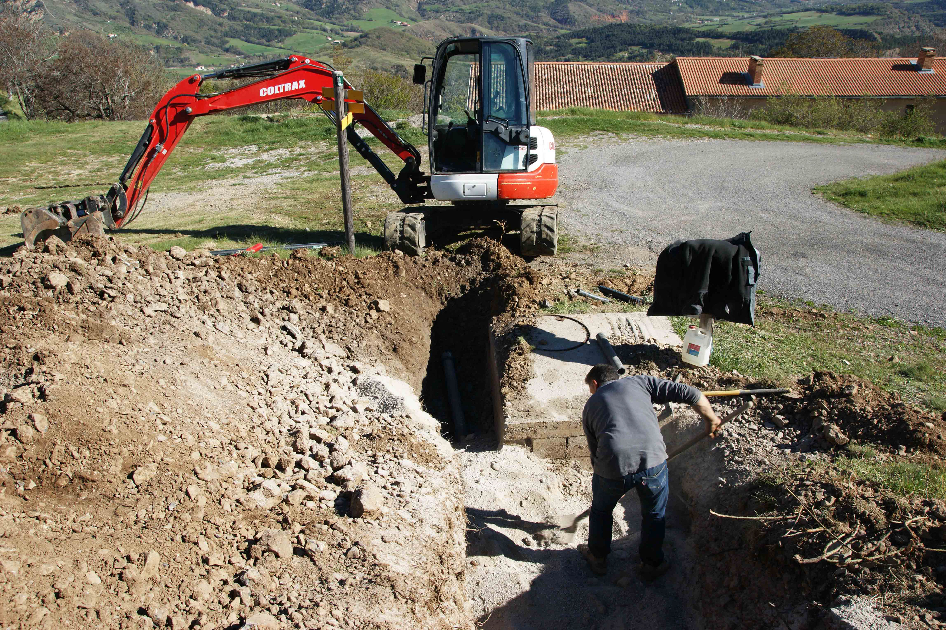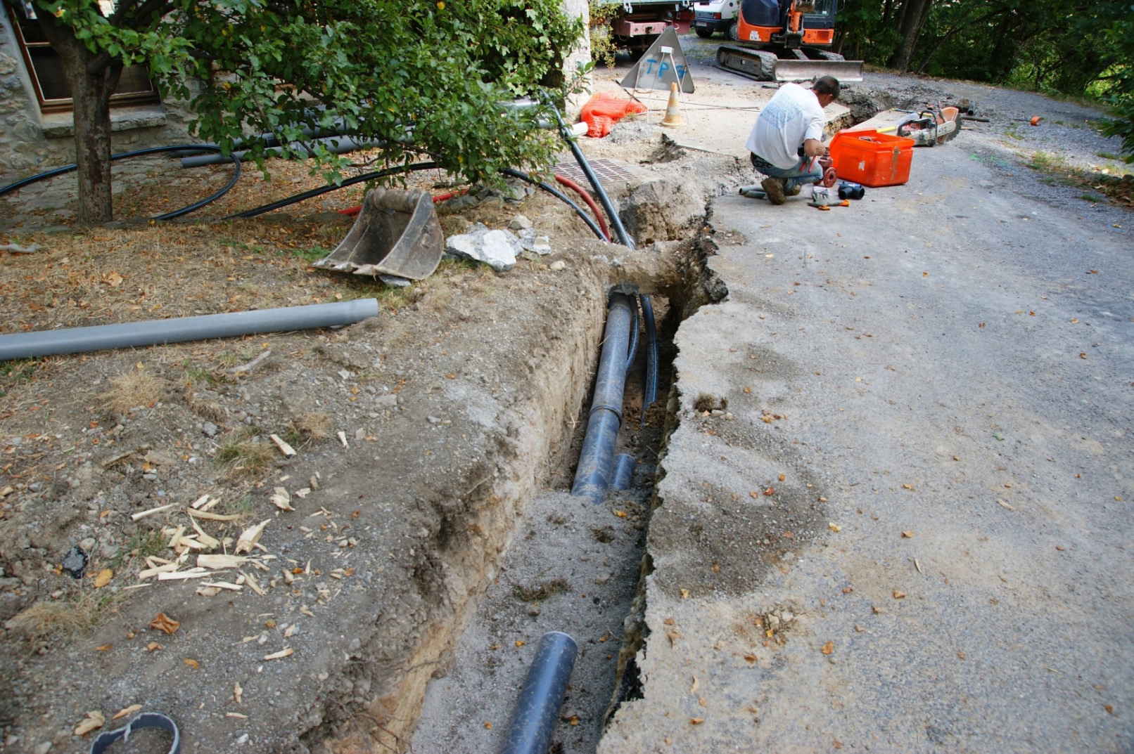 Eaux pluviales route + eaux de toiture Mairie, arrivée de l'eau de source en 32 mm pour l'table et grange sur la droite de la photo