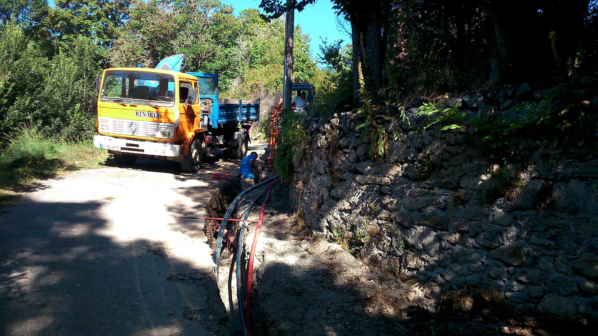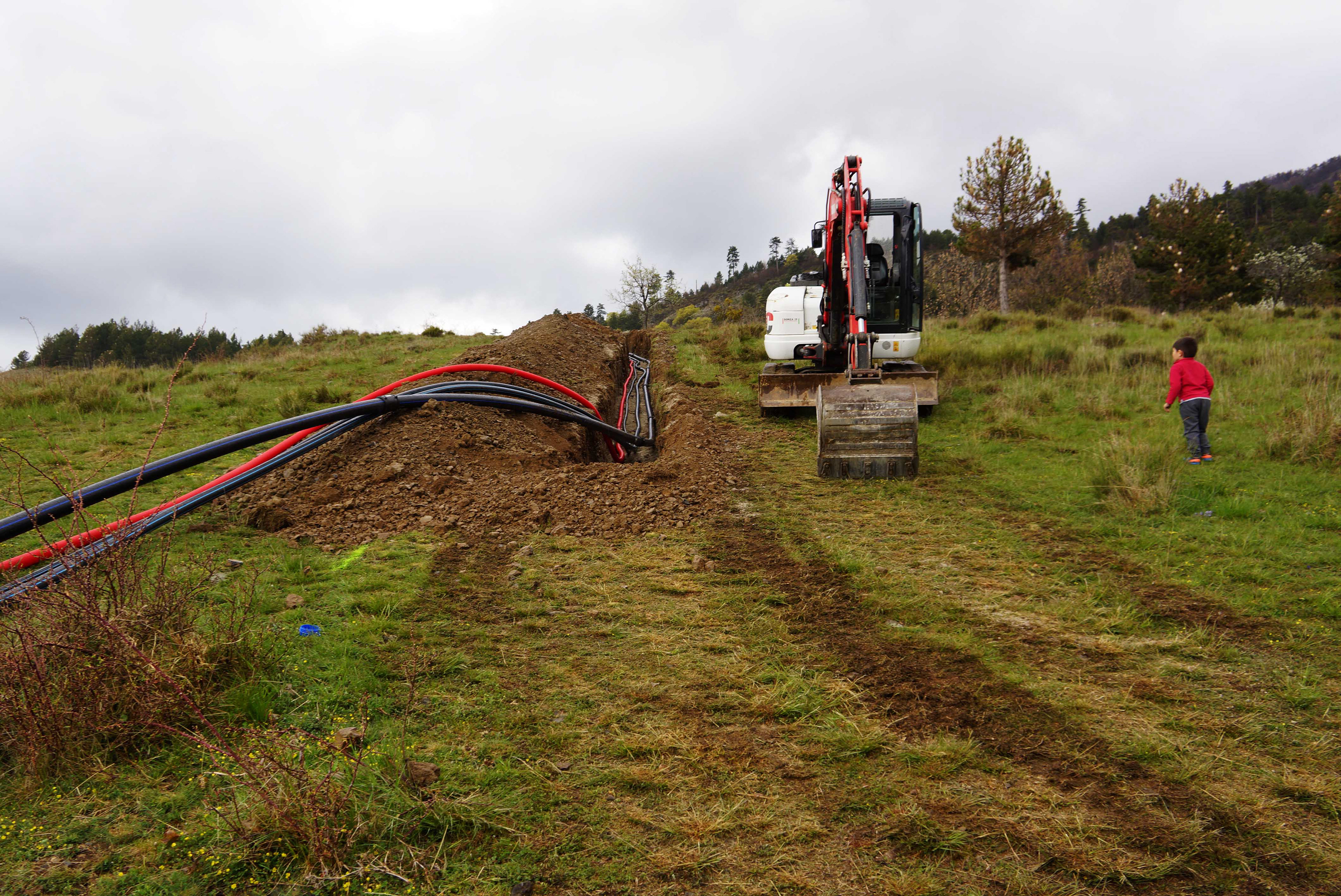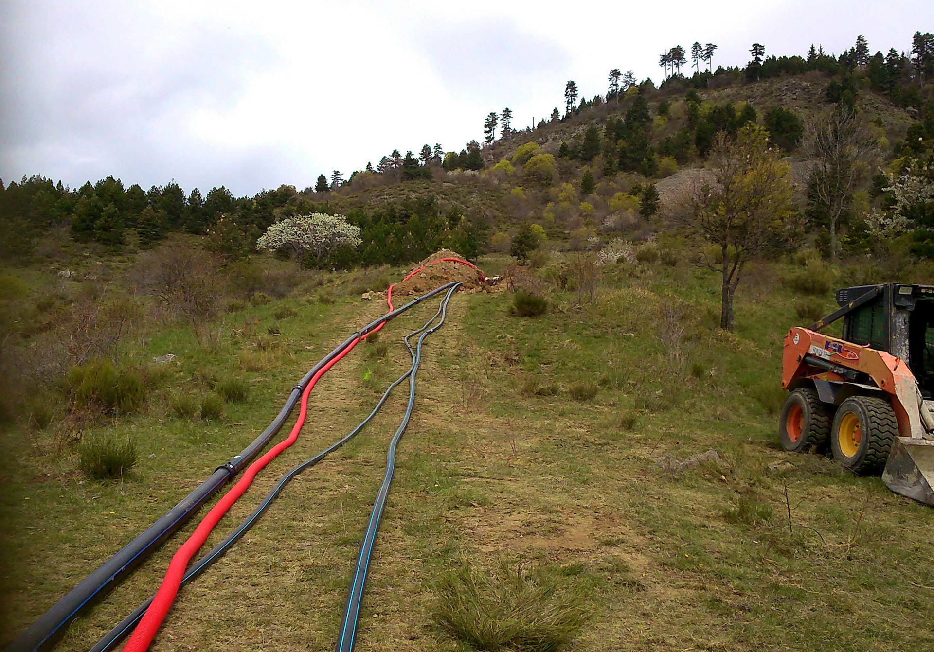Gaine et cable électrique pour gestion du remplissage du réservoir du Haut-Mélan par refoulement. Canalisation 110 mm pour borne incendie n°8. D50 canalisation de refoulement. D75 canalisation de distribution vers Mélan.