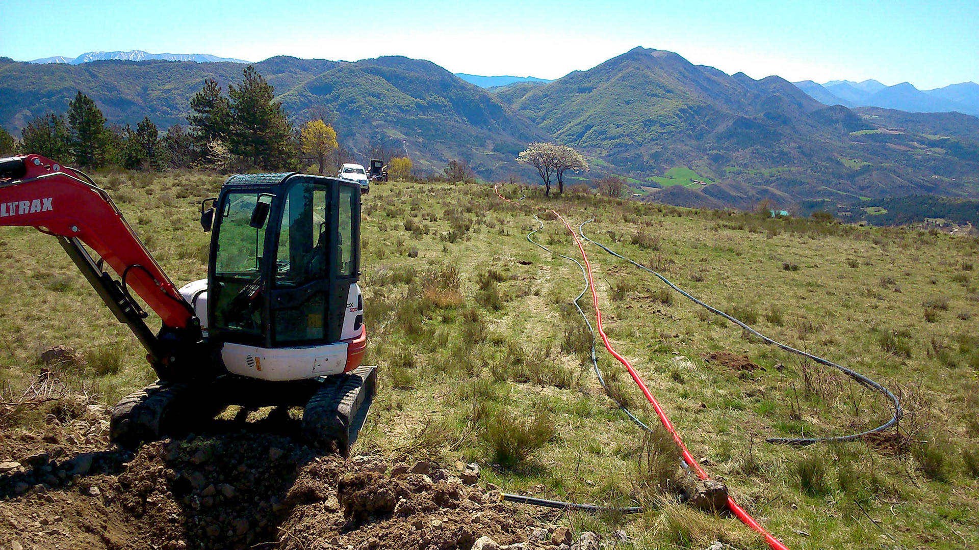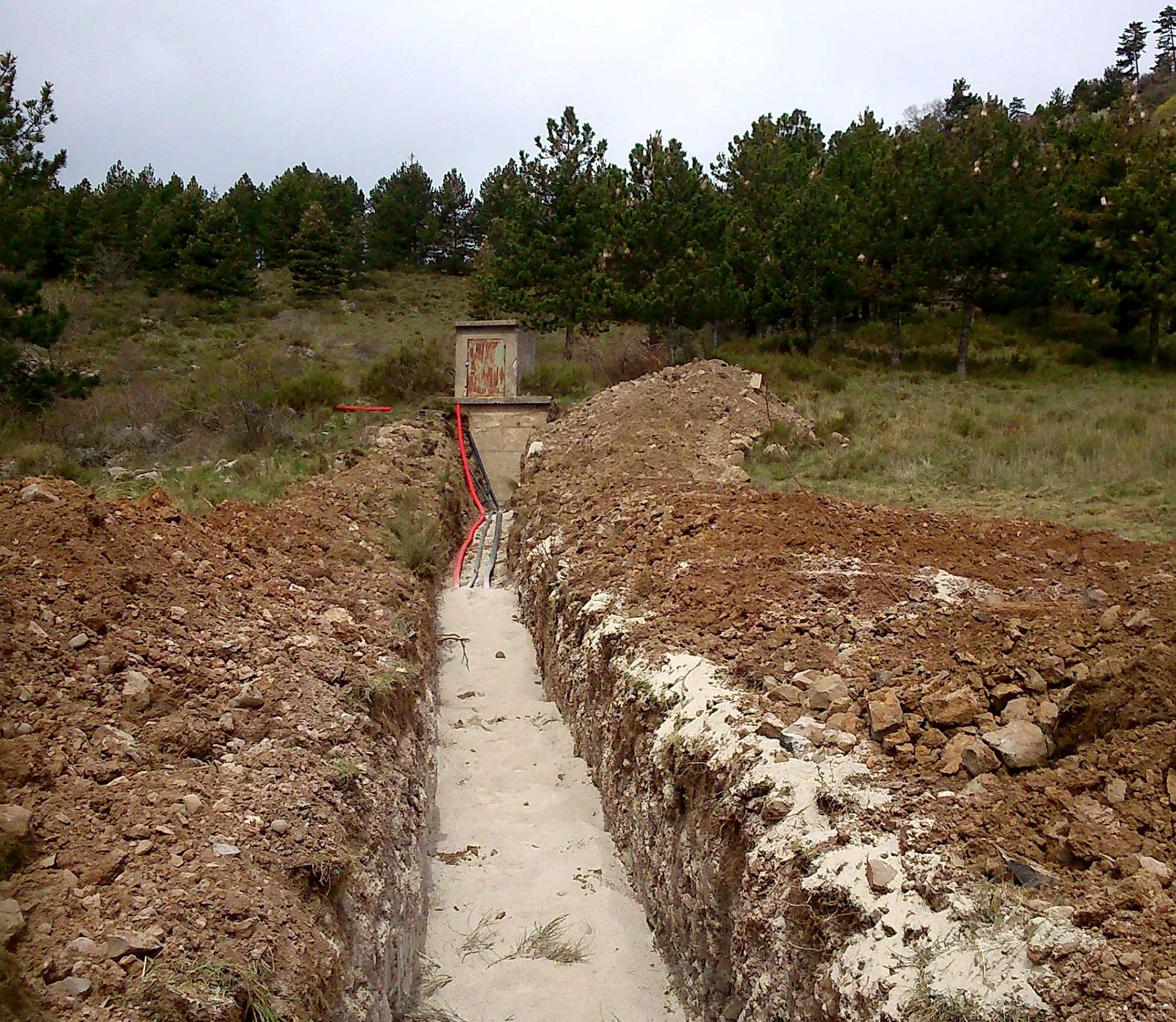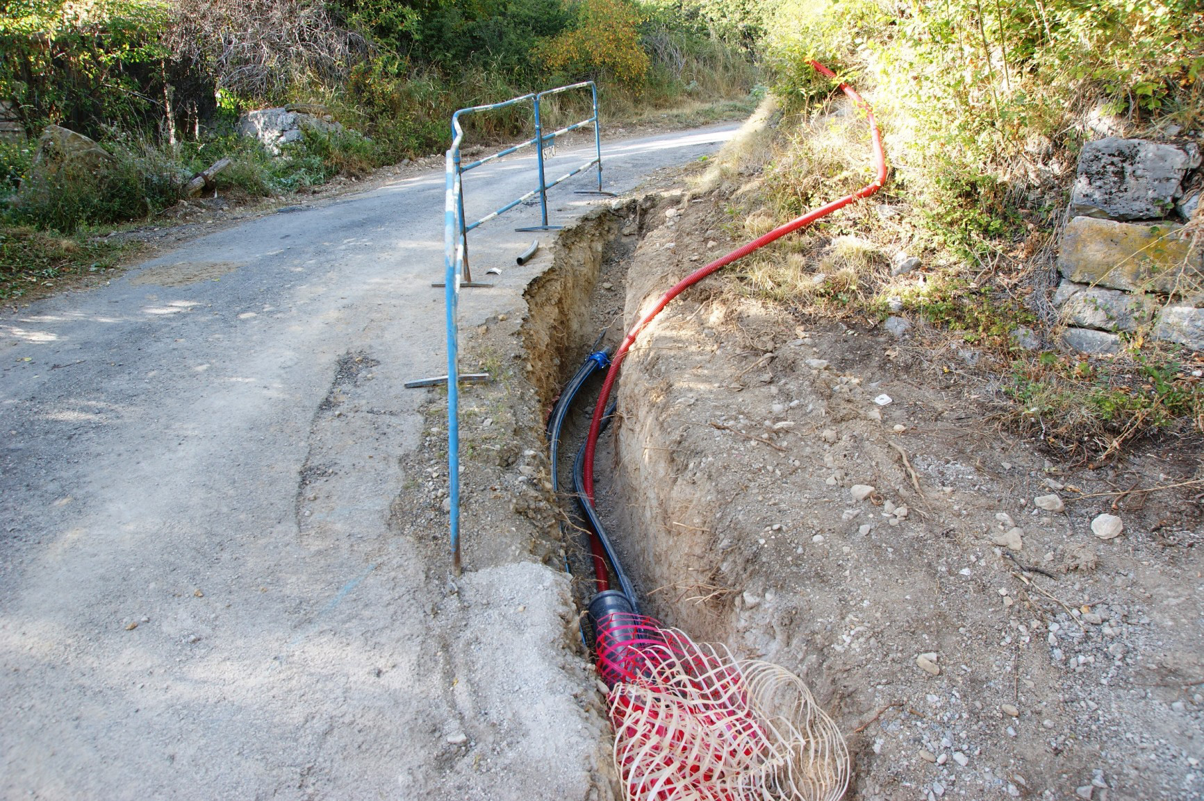 Gaine et cable électrique pour gestion du remplissage du réservoir du Haut-Mélan par refoulement. Canalisation 110 mm pour borne incendie n°8. D50 canalisation de refoulement. D75 canalisation de distribution vers Mélan.