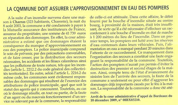 - les bornes Numéro 1 & 2, respectivement situées en aval d'une cascade de 3 & 2 réducteurs de pression sur le réseau d'eau potable ont un débit instantané de 67 & 66 m3 par heure, débit qui décroît brutalement après 10 à 15 minutes de soutirage notamment vérifié sur la borne Numéro 1, un débit très insuffisant pour lutter contre un incendie ou pour remplir la cuve d'un camion de lutte contre le feu. En la matière, la préconisation des visites départementales de Sécurité est sans ambiguïté : "Implanter un poteau incendie ou une citerne permettant aux sapeurs-pompiers de trouver sur place, en tout temps, 120 mètres cubes d'eau utilisables en deux heures conformément à la circulaire interministérielle du 10 décembre 1951."
