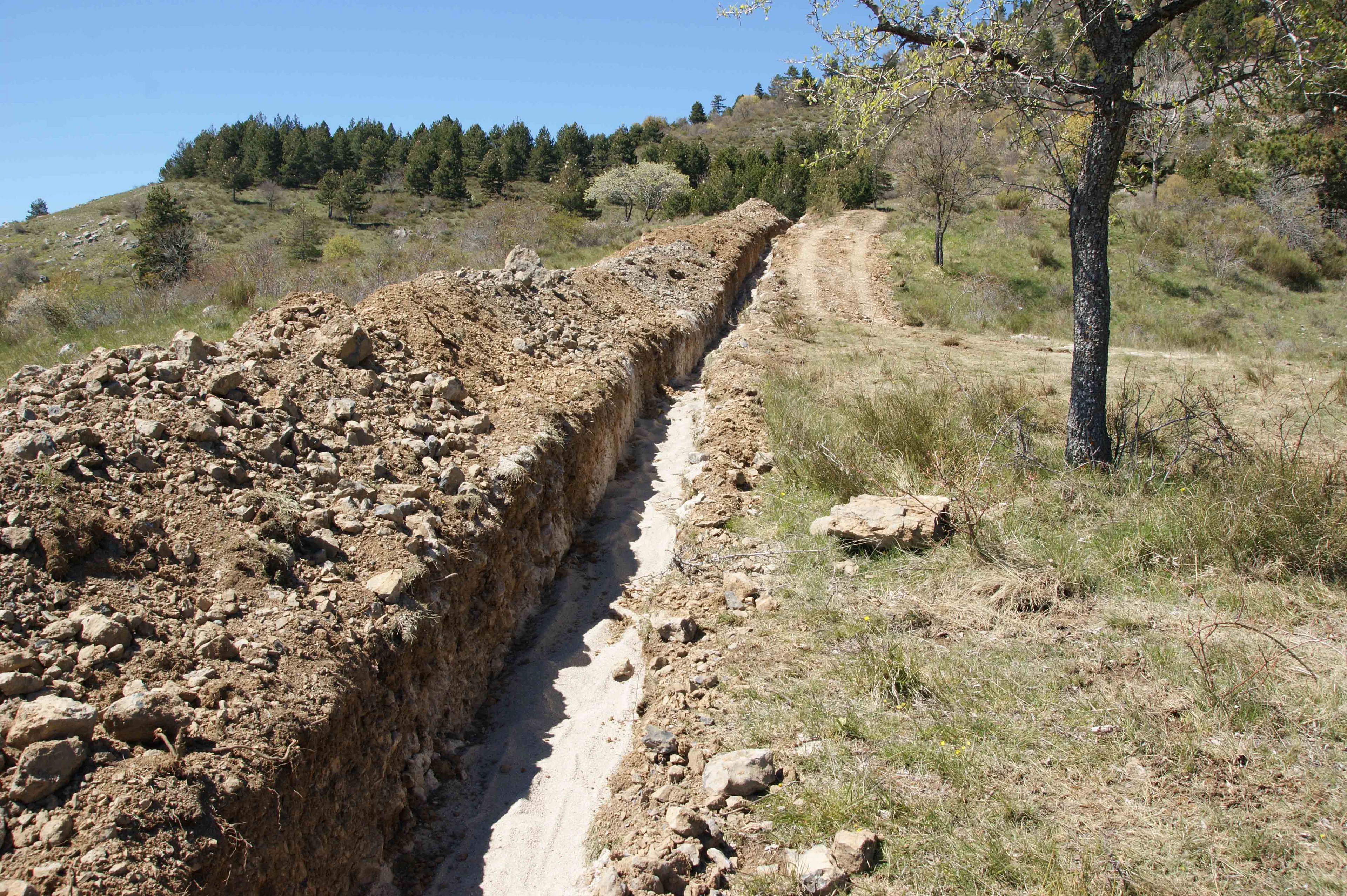 Pose d'une canalisation 50 mm en attente jusqu'au regard pour l'eau de source dédiée au hameau du Castellard. En attente de remplacement et redimensionnement de la canalisation métallique qui date des années 50
