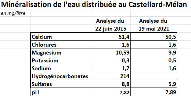 L'eau distribuée sur la commune du Castellard-Mélan provient d'une source dont la qualité de l'eau est bonne, mais son débit peut décroître jusqu'à 3 litres par minute à l'étiage tel que relevé le 28 novembre 2022.