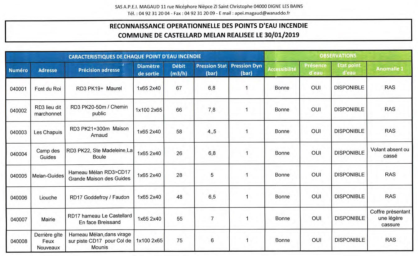 - la bouche incendie Numéro 5 à Mélan a été doublée par une nouvelle borne incendie, la Numéro 8 dotée d'une réserve et une canalisation distincte du réseau d'eau potable, capable de délivrer 120 m3 d'eau en 2 heures,
