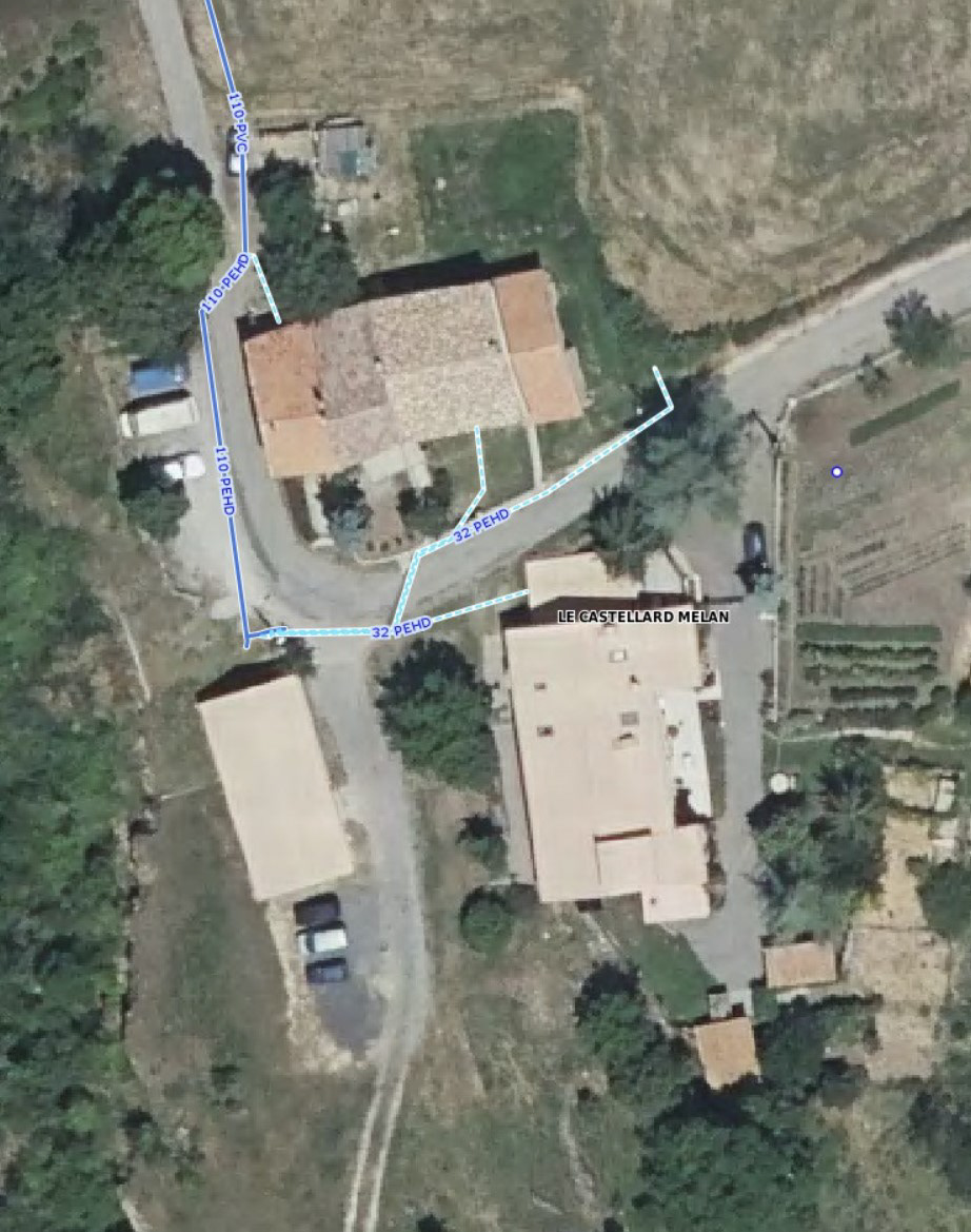 Point de raccordement avec l'évacuateur des eaux, diamètre 160 mm réalisé par la commune en 2013 pour son prolongement en 2023 jusqu'en aval du cimetière réalisé par la Maison technique du Département 04 Digne les Bains.