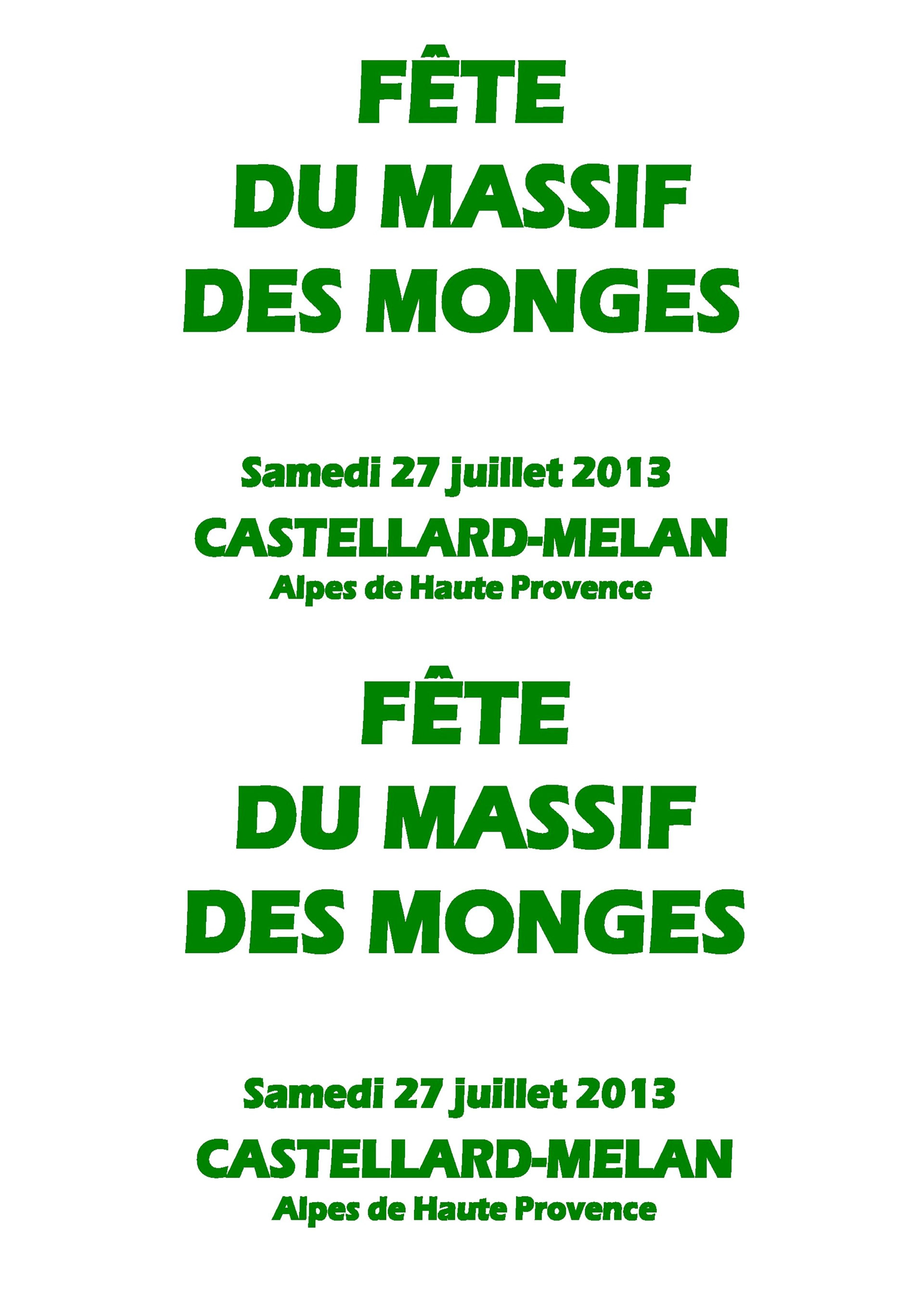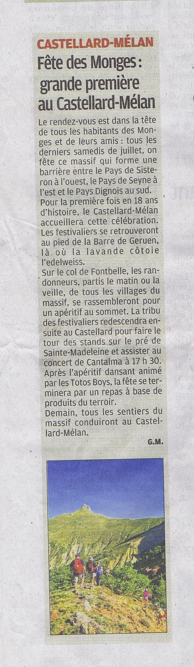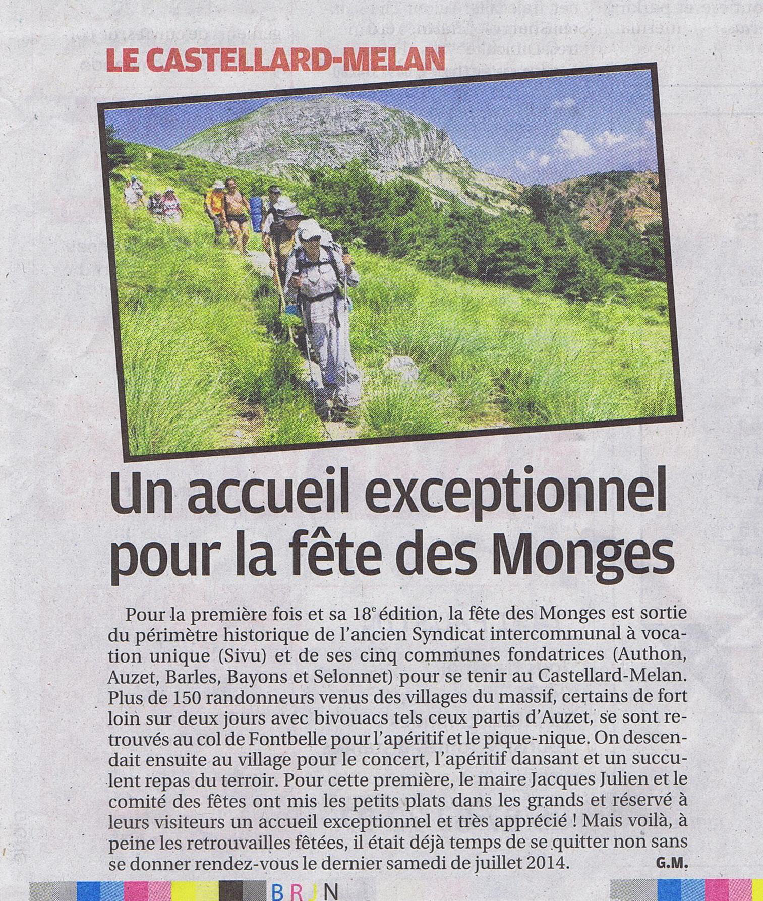 Pour la première fois et sa 18 ième édition, la fête des Monges s'est tenue au Castellard-Mélan. Plus de 150 randonneurs se sont retrouvés au col de Fontbelle puis à Mélan pour un concert et le repas du soir. (GM, du journal La Provence)