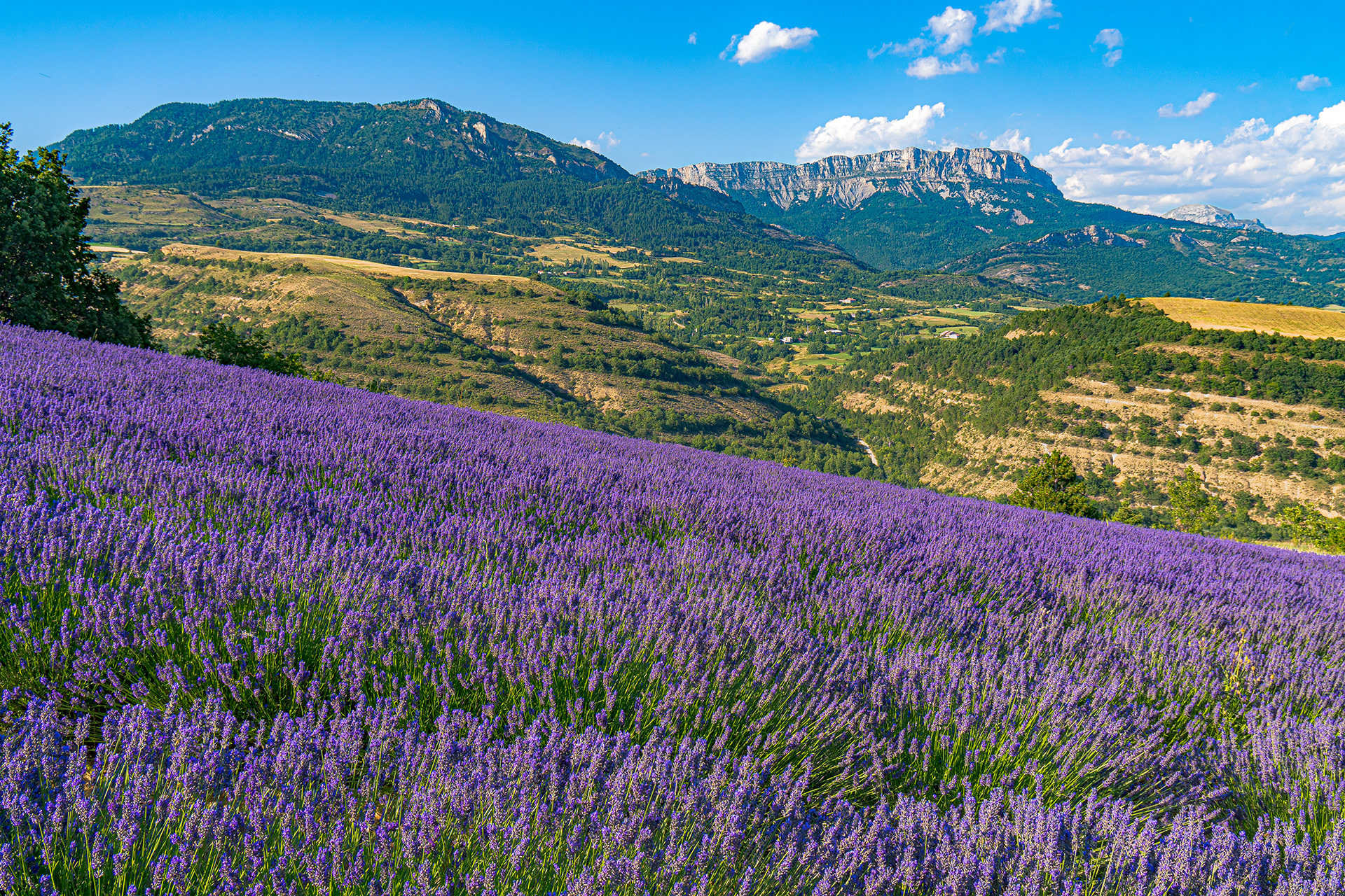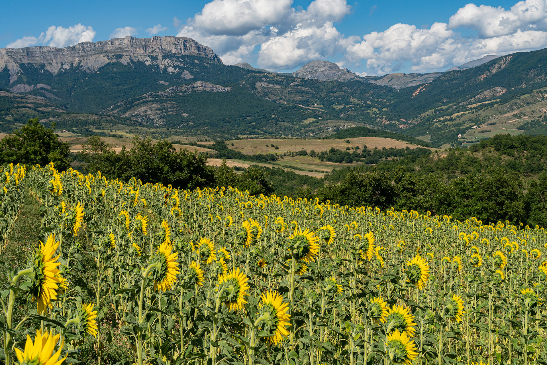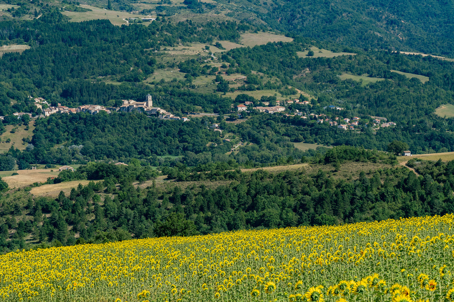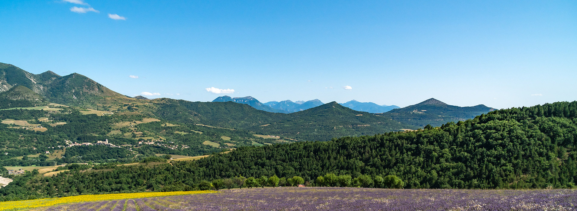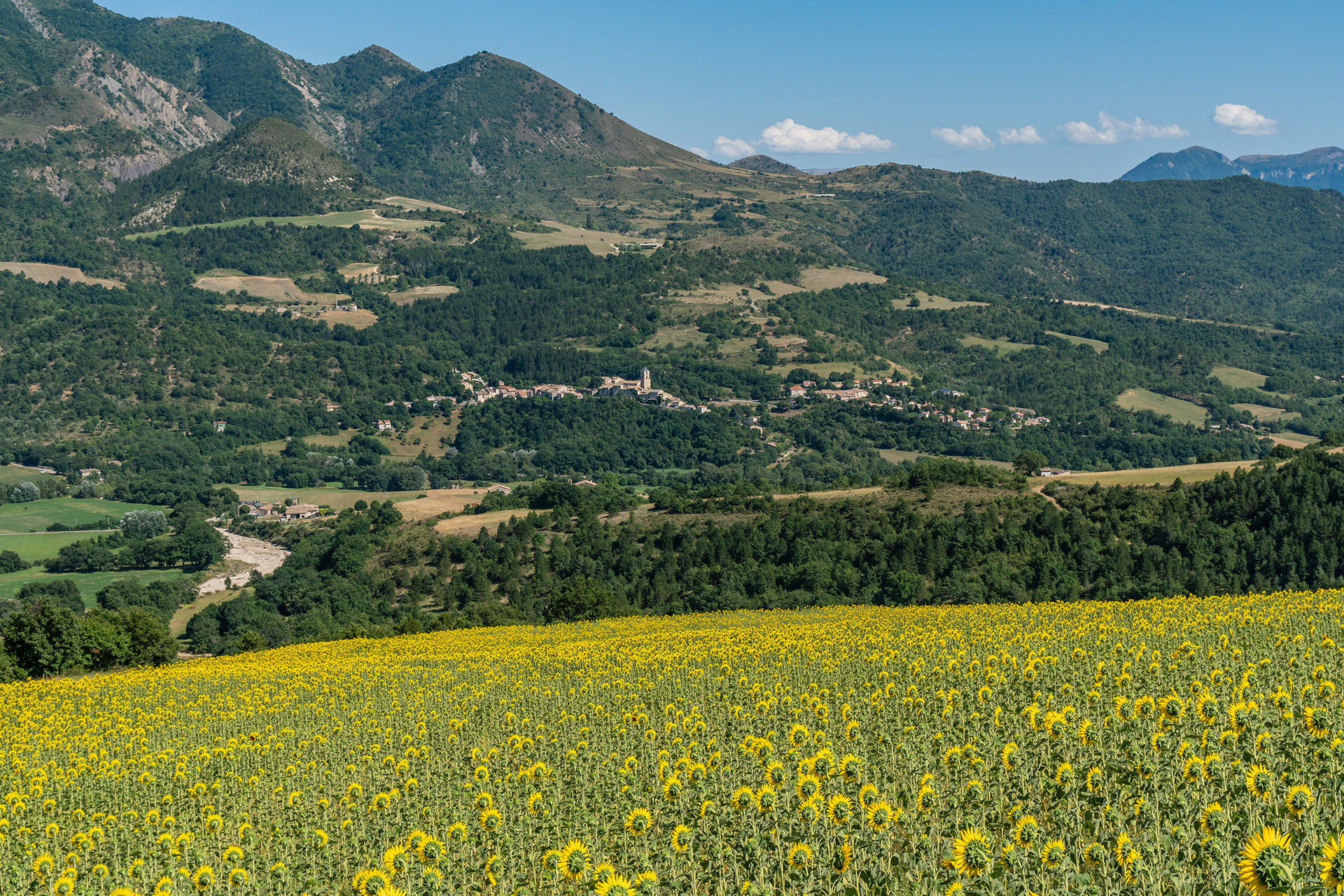 A la confluence du torrent des Duyes et de son affluent Chevalet (ravin des Graves) adossé à la colline Saint-Joseph, vues sur Thoard, les montagnes de Mélan, de Géruen, la Cloche de Barles, le Siron, le Pic d'Oise, ...