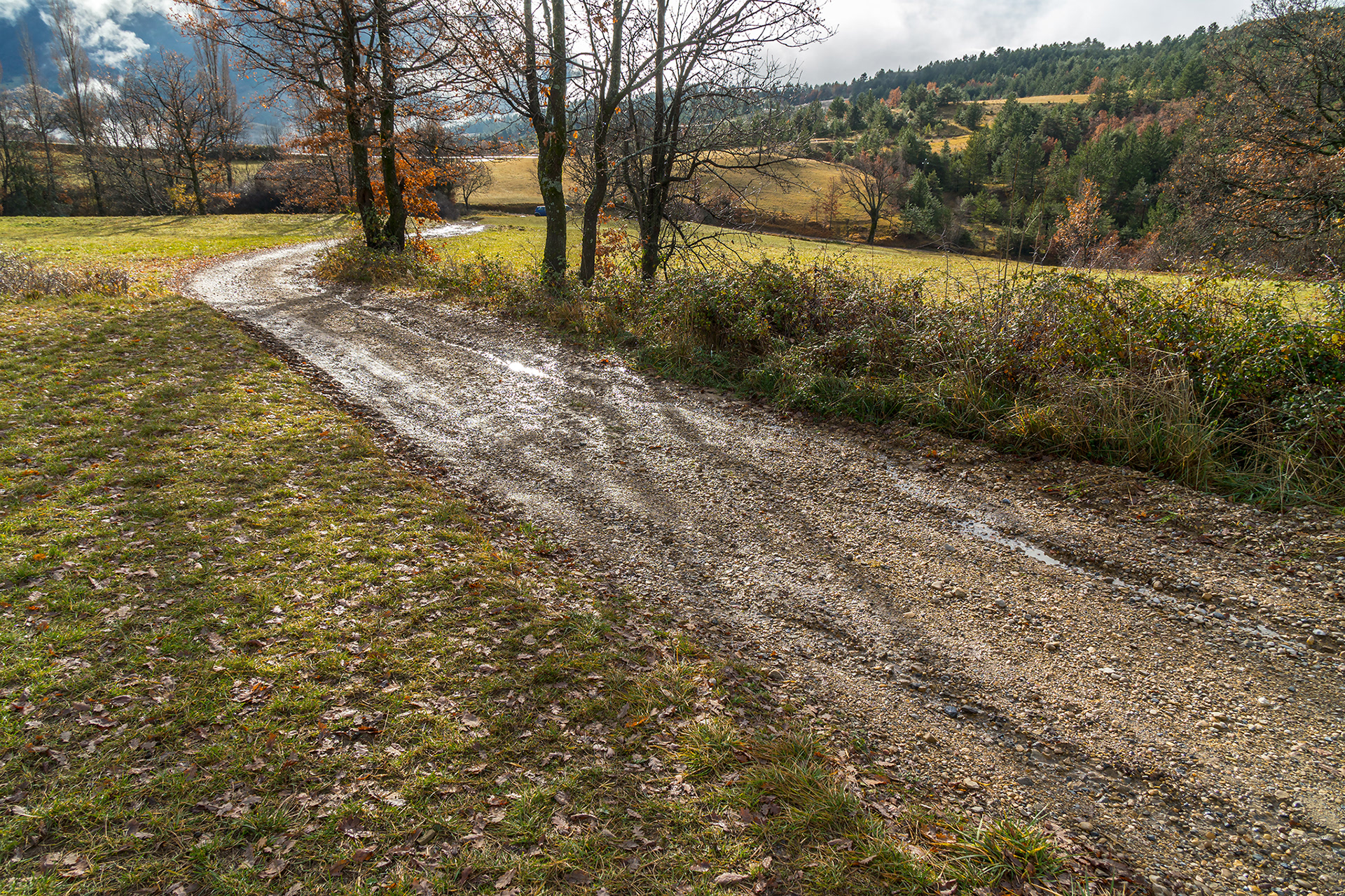 2019, Consolidation du profil du chemin de la Combe par broyage et compactage de fond sur 1 km, création de revers d'eau indispensables dont celui en bas du chemin de la Faÿsse en amont du vallon des Collons