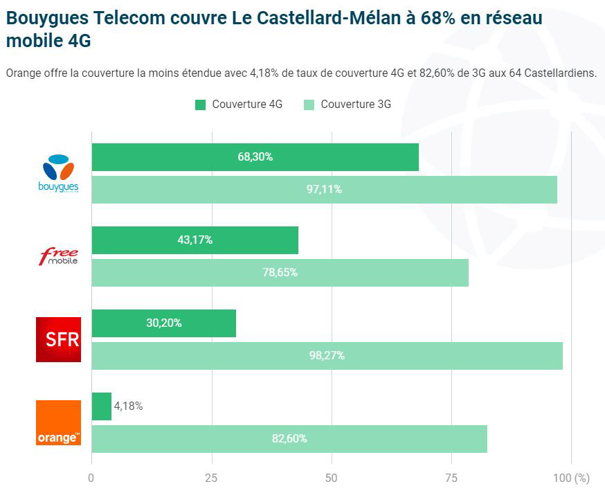 Situation 2023 : avec la mise en place du plan d'adressage, de nombreuses adresses sont éligibles à la fibre optique, au Castellard-Mélan. Quelques écarts proches ou distants de la ligne sur la voie publique support de la fibre sont à examiner au cas par cas entre les intéressés et Orange notamment pour prétendre à leur égibilité. Seuls les opérateurs réseau sont habilités à rendre éligible l'adresse d'un riverain à portée de fibre et d'un répartiteur d'abonnés sur le poteau télécom public.